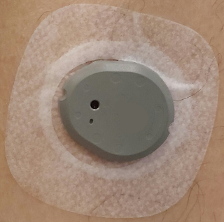 A Continuous Glucose Monitor (CGM patch) worn over the skin